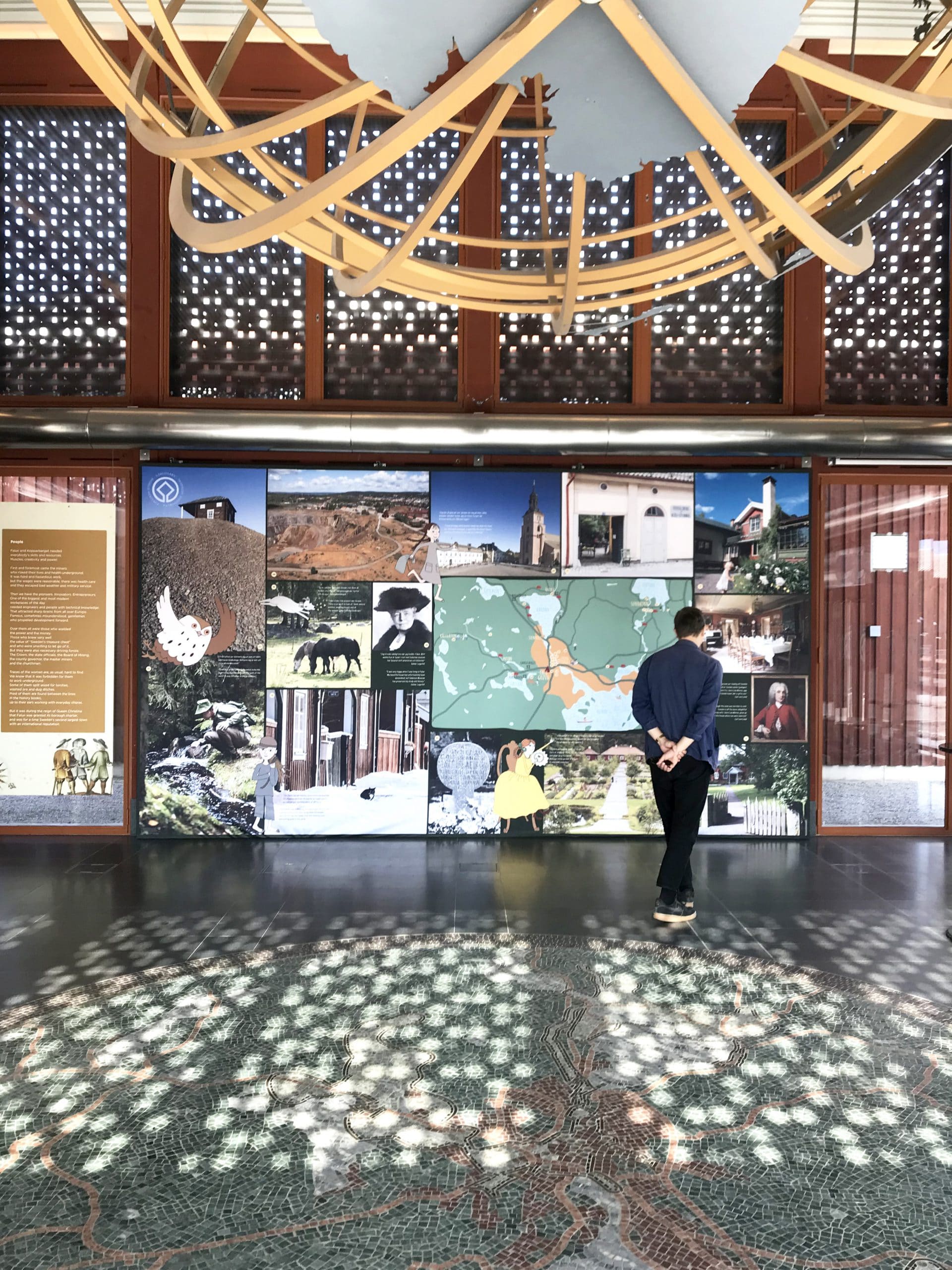 En hel vägg täcks av en illustrerad karta över Världsarvet Falun, som utöver gruvan består av Falu stad och bergsmansbygden runtom.